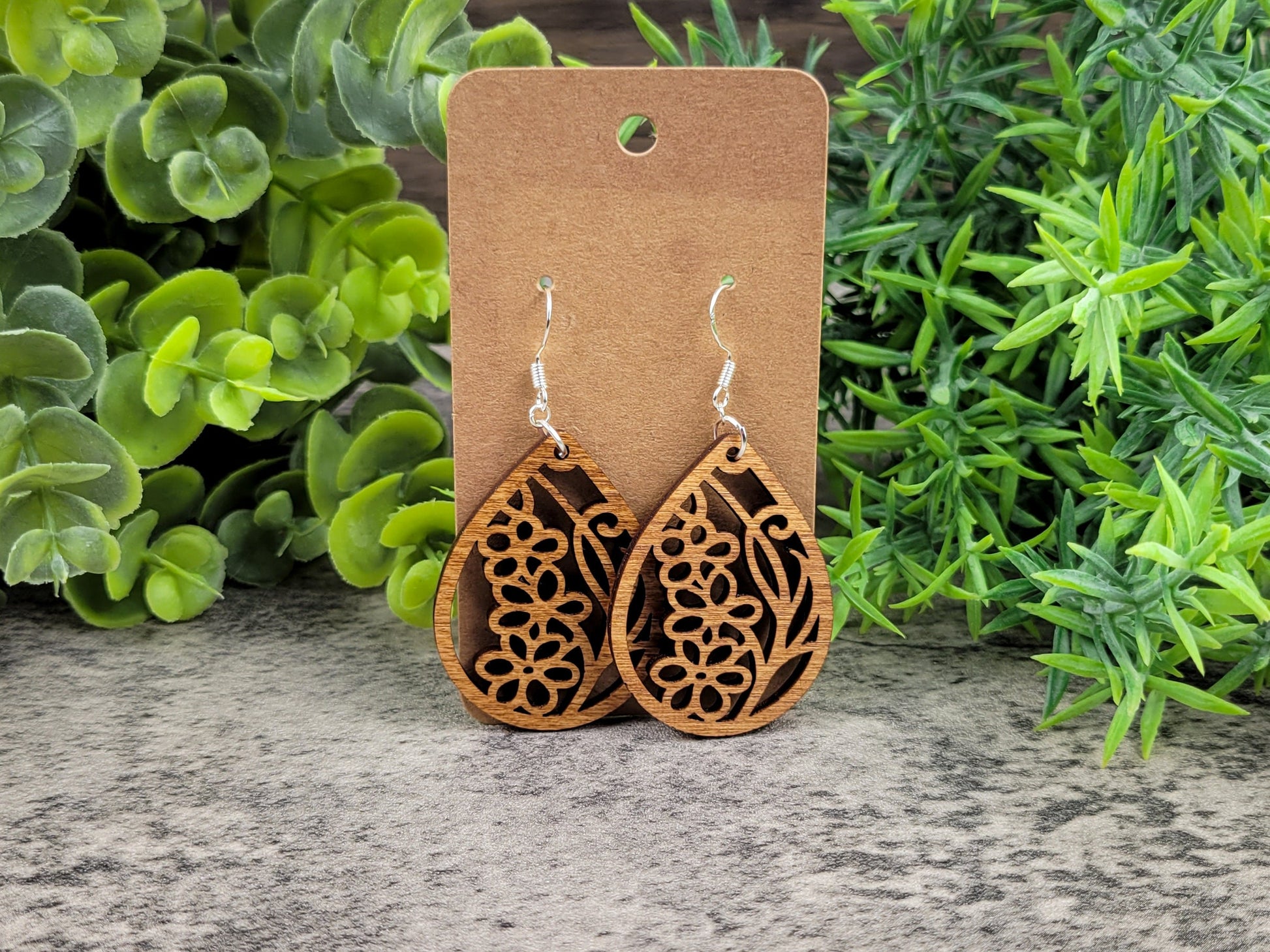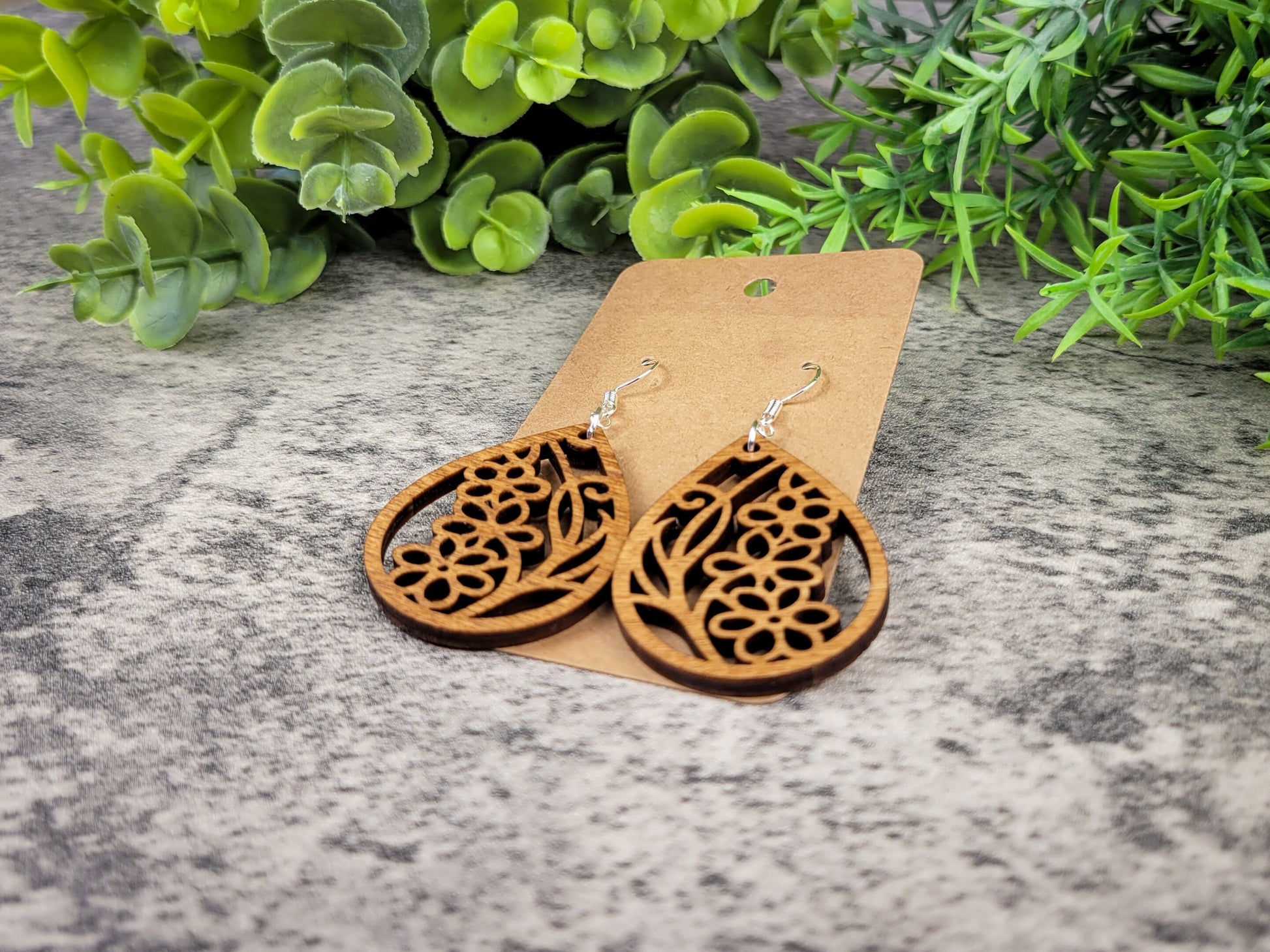 Delicate and nostalgic, these Forget-Me-Not Teardrop Earrings are laser-cut from birch with fine floral detailing. Paired with hypoallergenic sterling silver-plated hooks, they make a heartfelt gift for gardeners, flower lovers, and anyone who appreciates handcrafted charm.